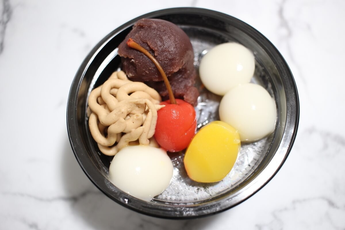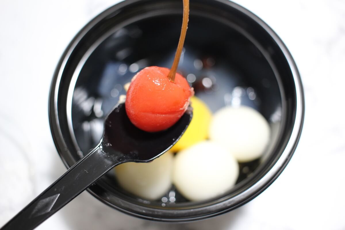 下部には弾力のある寒天、上部には白玉、黄桃、さくらんぼなどがのっていて、とっても華やか!