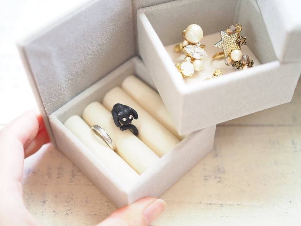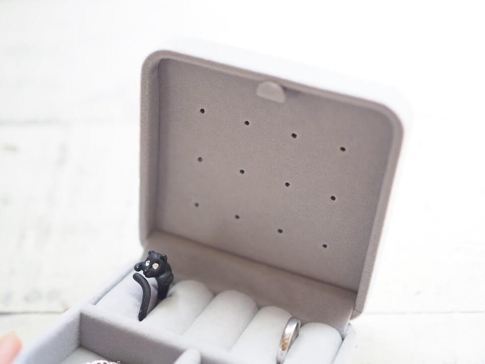 リングは柔らかいクッションに差し込んで固定できるので、アクセサリー同士がぶつかって傷ついてしまうのも防げます。