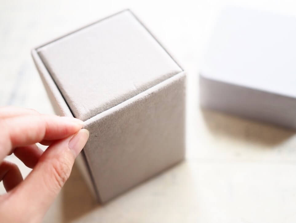 こちらも高級感のあるグレーカラーのベロア調で、ボックスタイプの2段式収納ケースになっています。