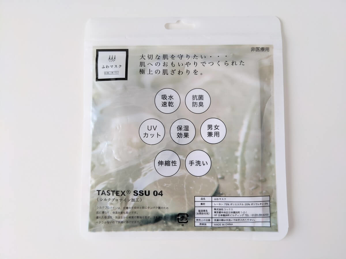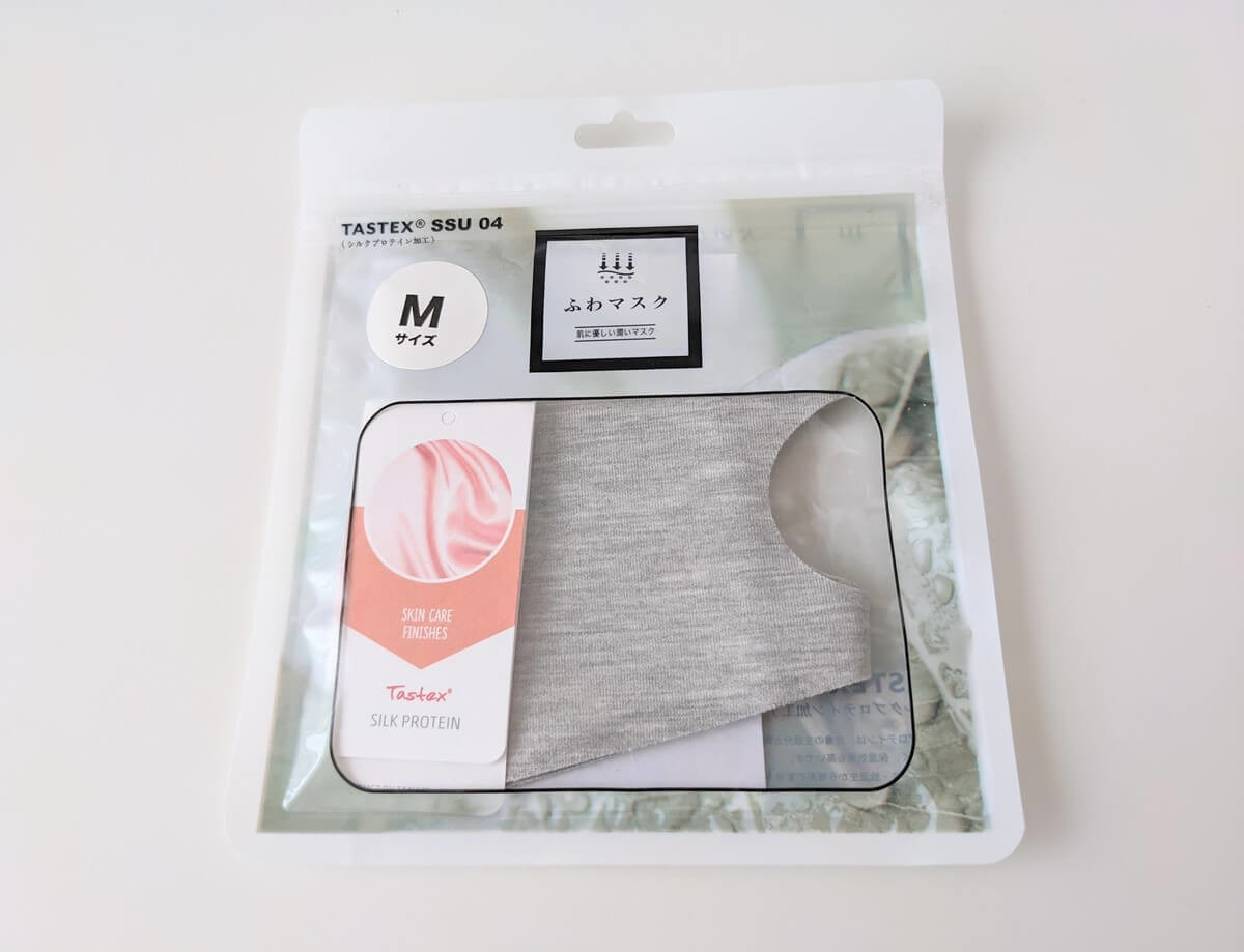 ふわマスクに使われている成分はすべて天然物由来、化粧品由来のスキンケア加工が施されています。 実際に触れてみると、しっとり滑らかな肌触りで気持ちが良いです。