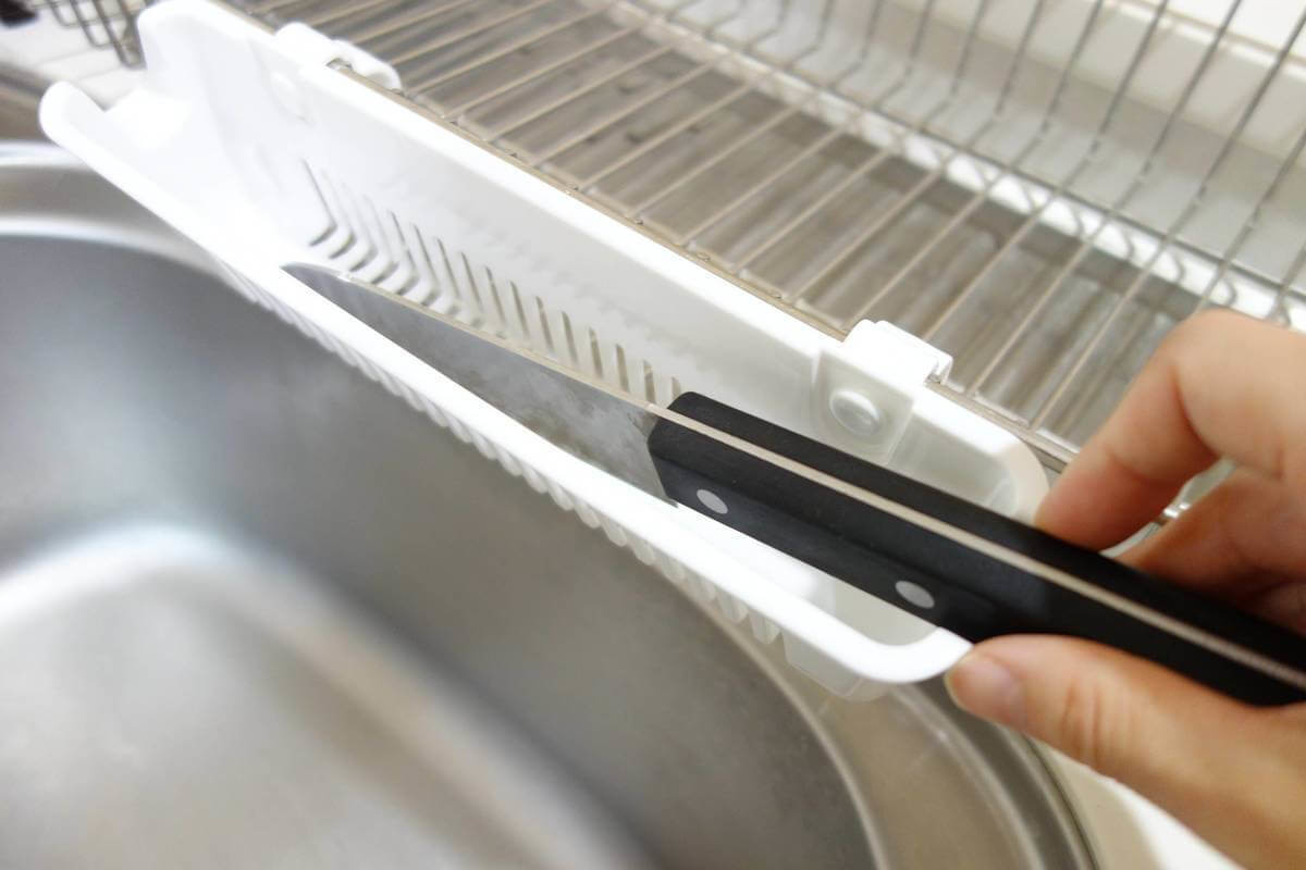 水切りカゴに包丁置きが付いている場合はいいですが、ないとついついキッチン台の上にポイと置いてそのまま……なんてこともありますよね。
