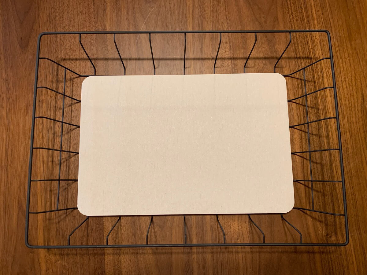 ワイヤーバスケットの底に珪藻土水切りマットを置きます。