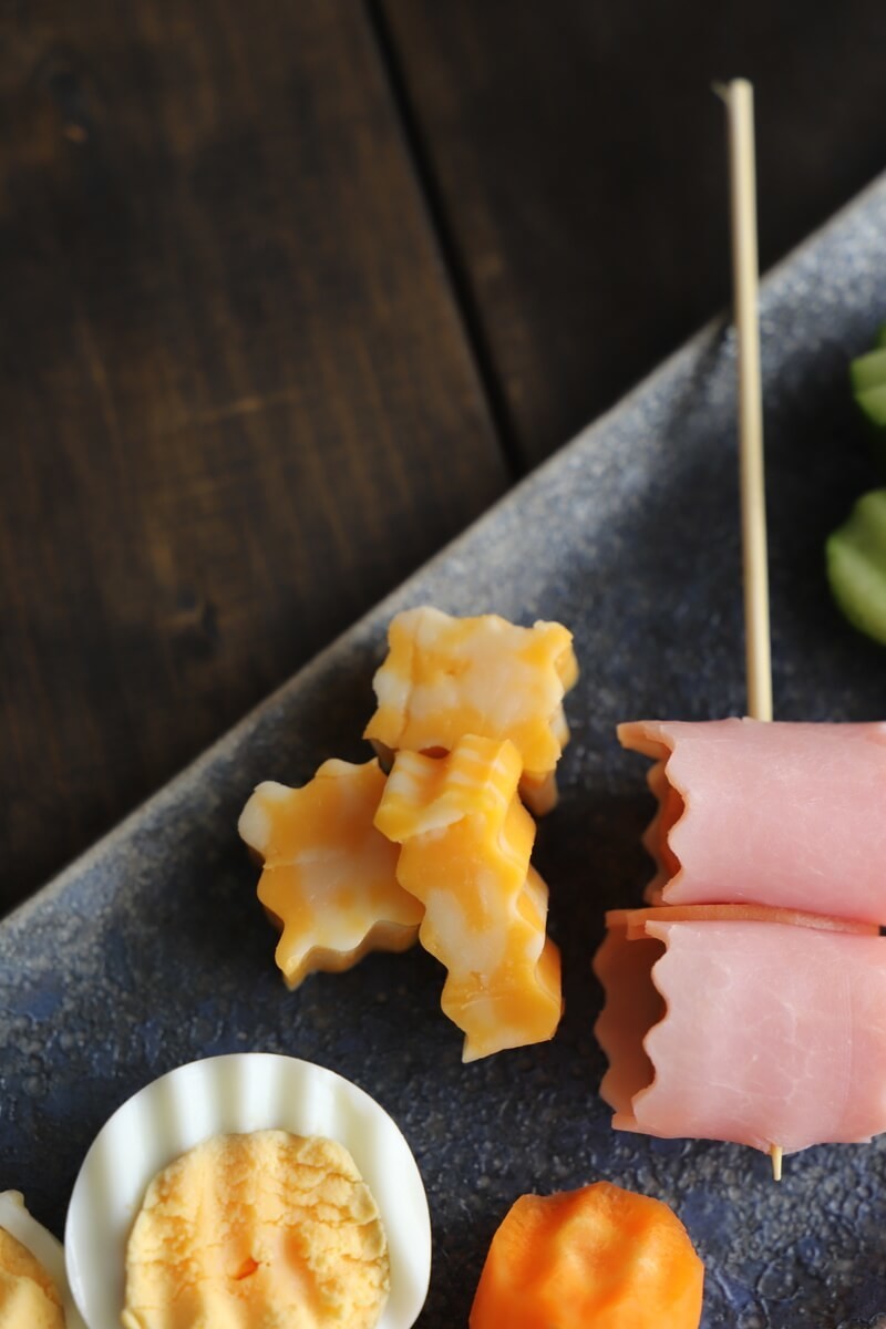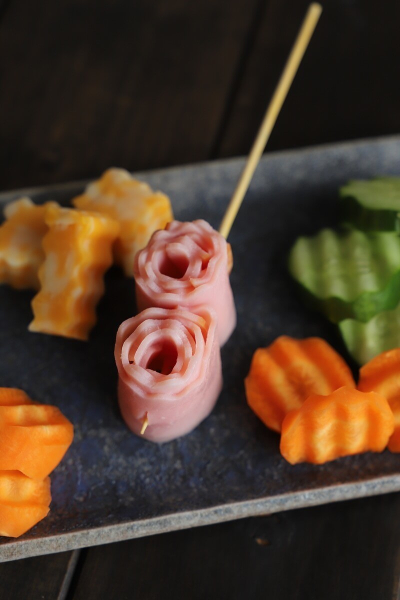 ハムは、3~4等分に細長く切り、小さなものからくるくると巻き、重ねて巻き……を繰り返し、竹串に刺すだけです。