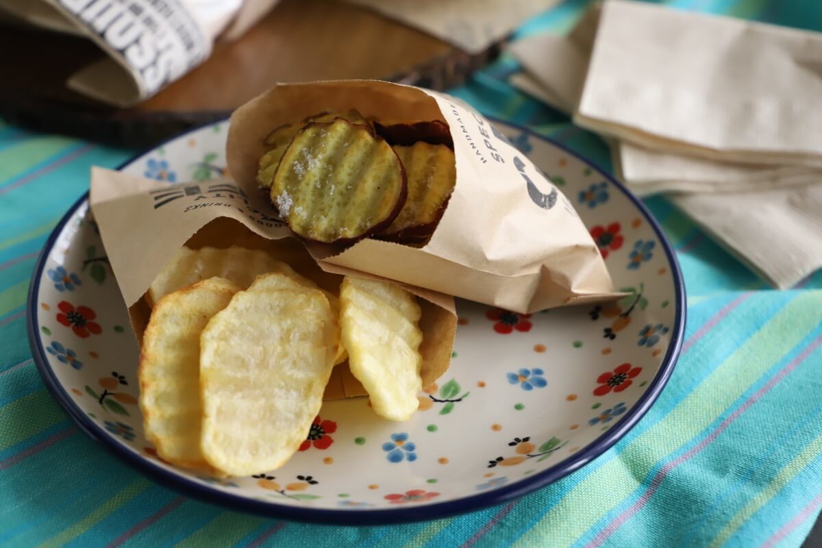 キツネ色になるまで素揚げ(または揚げ焼き)し、さつまいもには砂糖を、じゃがいもには塩を振っていただきます。