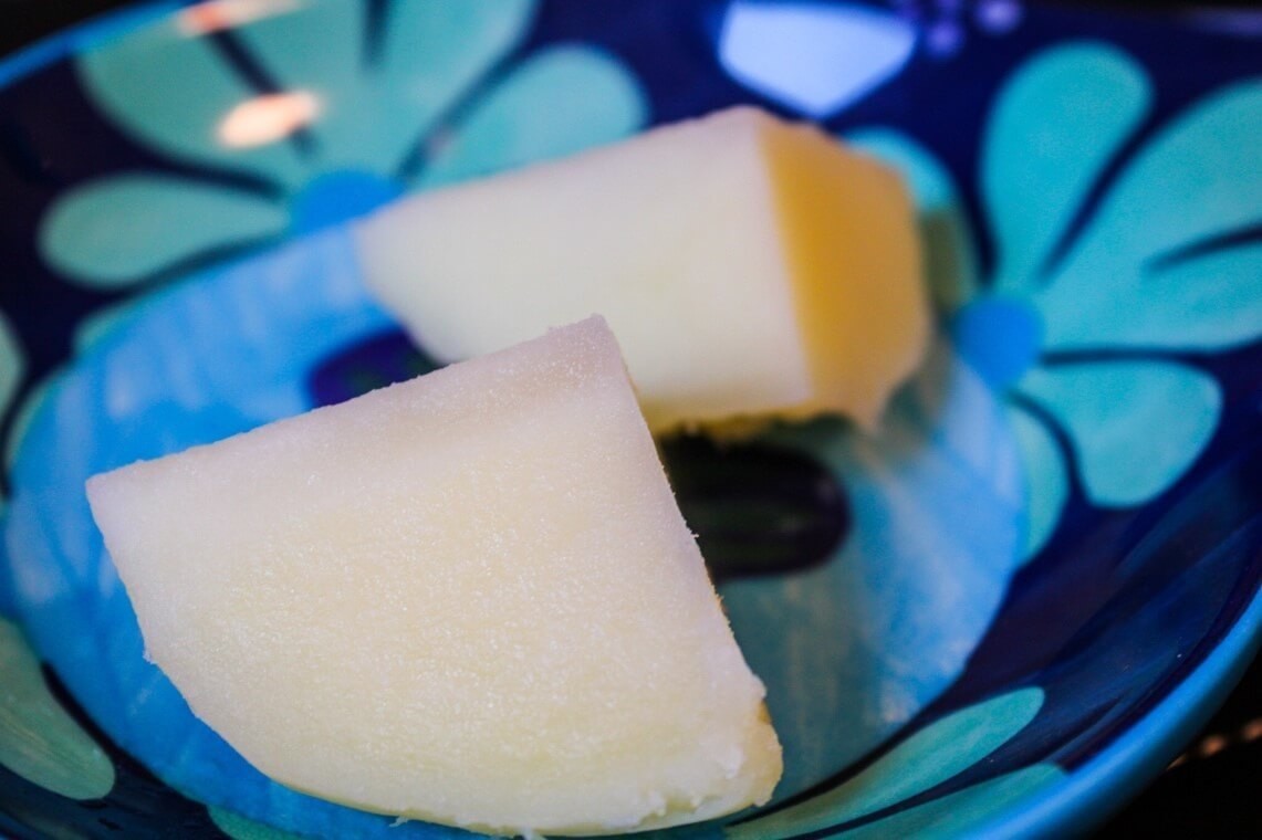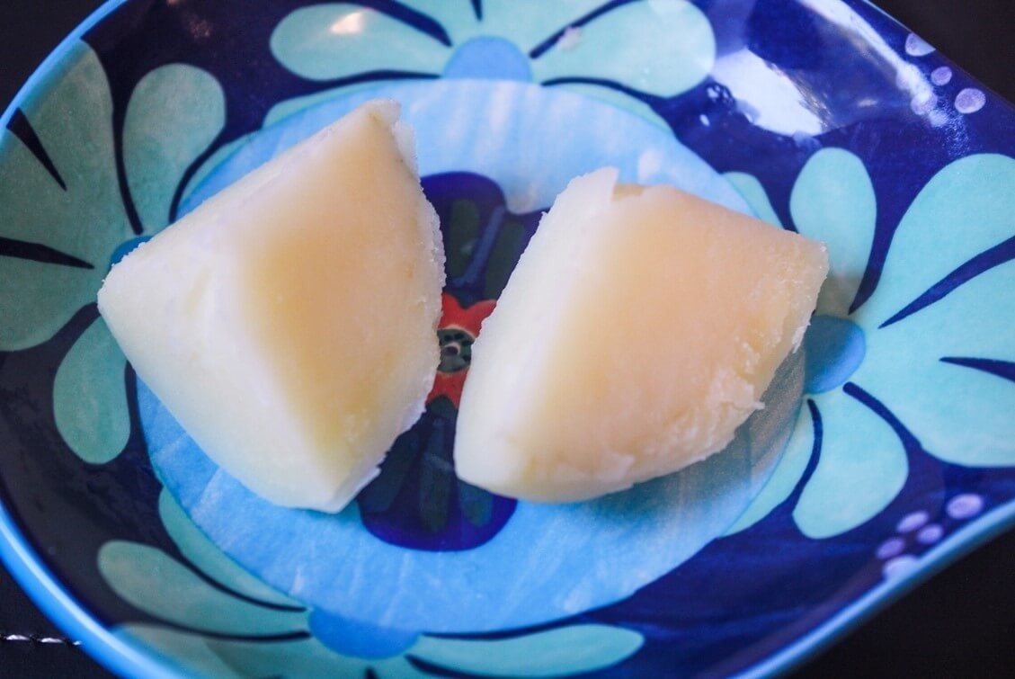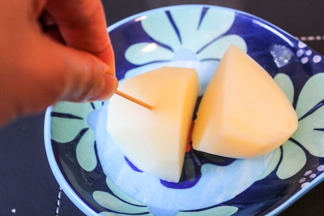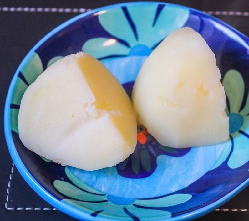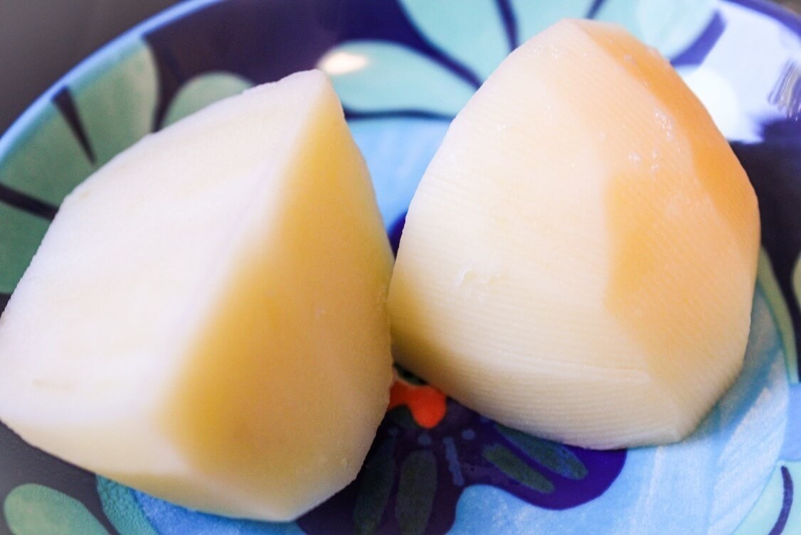 さて、内側はどうでしょうか?じゃがいもを半分に切ってみました。切った感触は固く、じゃがいもの芯の部分がまだ茹で上がっていませんでした。