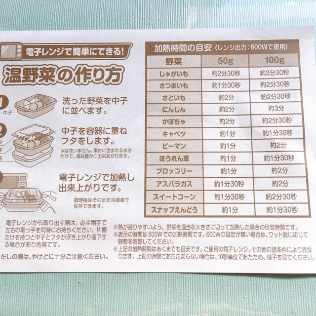 温野菜メーカーには加熱時間の目安表もついているので「何分くらい?」と迷うこともありません。
