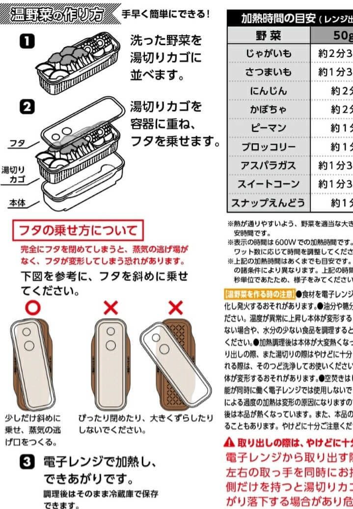 「蓋をずらして電子レンジにかける」など使い方に注意する点はありますが、温野菜メーカーでは入りきらない量を調理したい場合に重宝しますね。