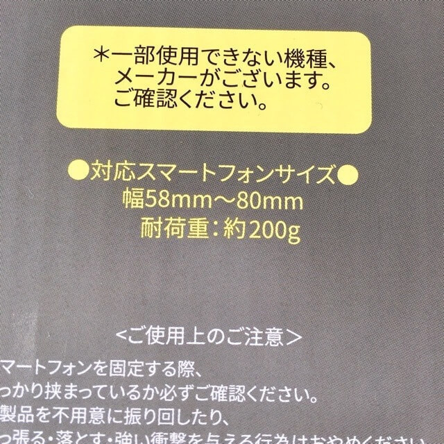 3COINSのスマホクリップホルダーは対応できない機種やサイズがあります。 対応スマートフォンサイズは、幅58mm~80mm。耐荷重は約200gです。