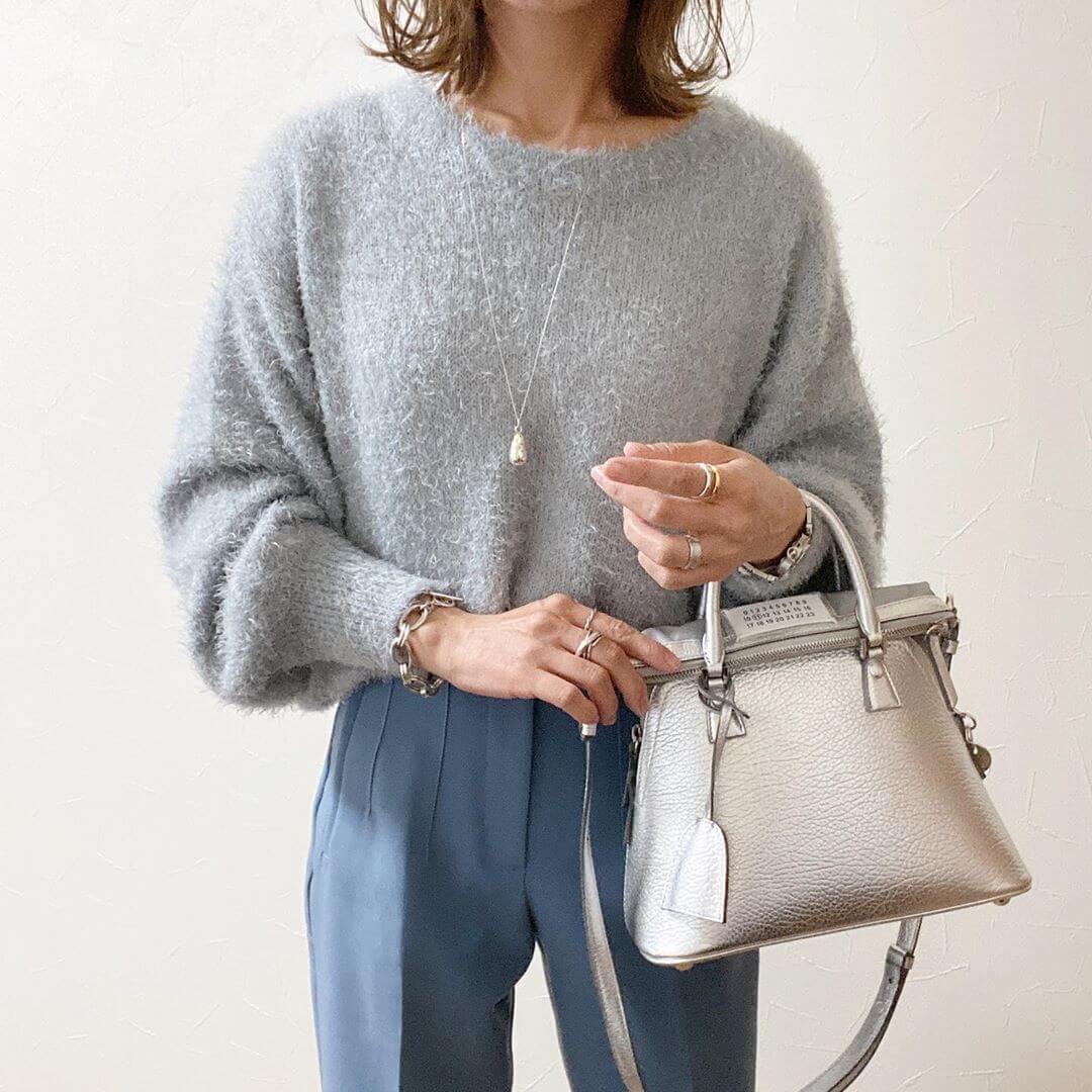 くすみブルーのグラデの洗練コーデにはシルバー小物を