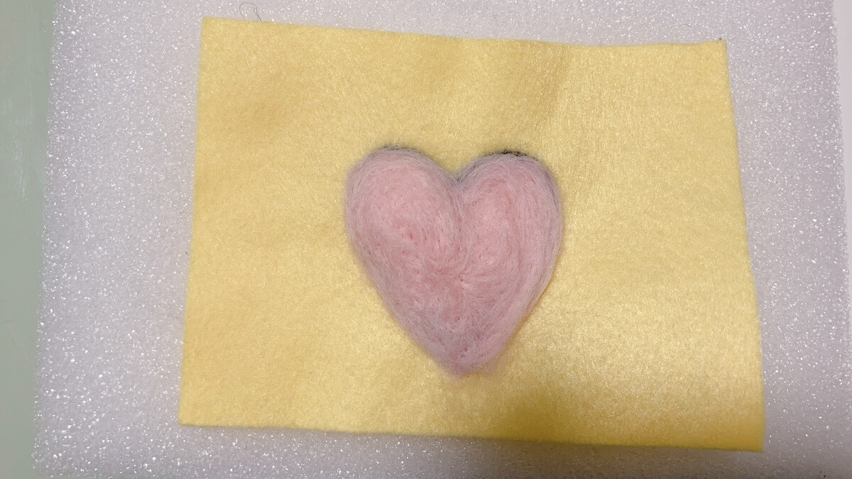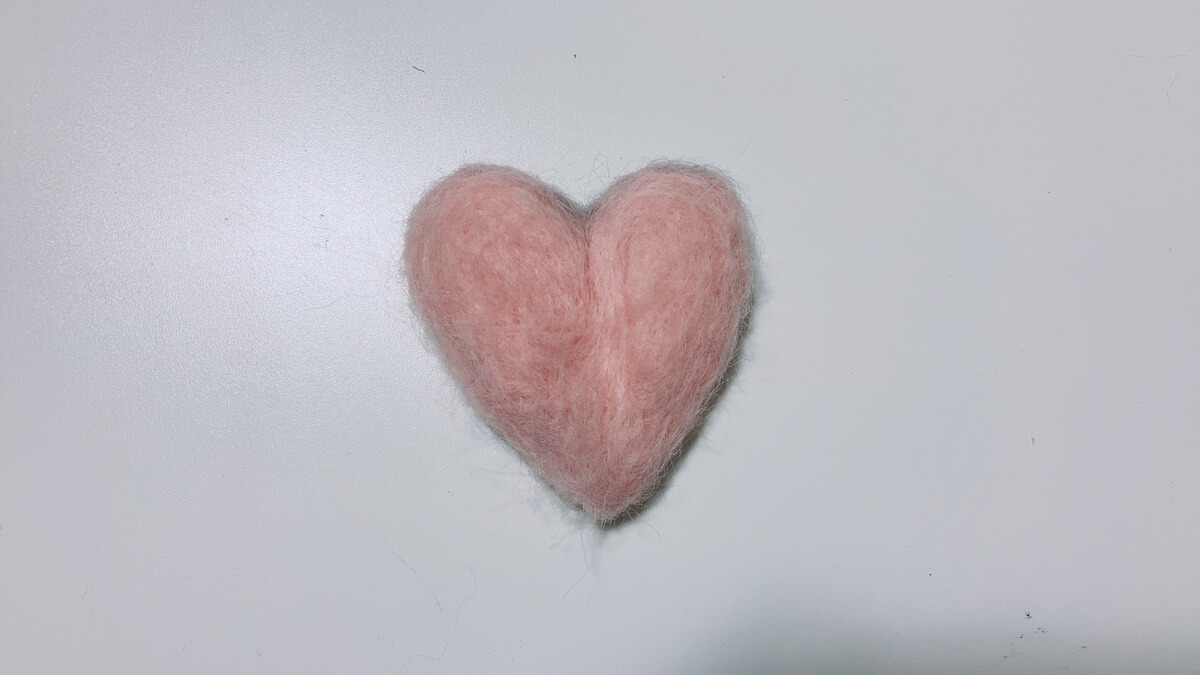 針を刺せば刺すほど小さく固まっていきますので、凹凸や窪ませたい部分は多めに刺してください。触るとふわふわな場合はまだ刺し方が足りない証拠です。しっかり固めることで安定した作品に仕上がります。ハートの真ん中の部分を窪ませるために多めに刺しました。全体を見て整えていきます。