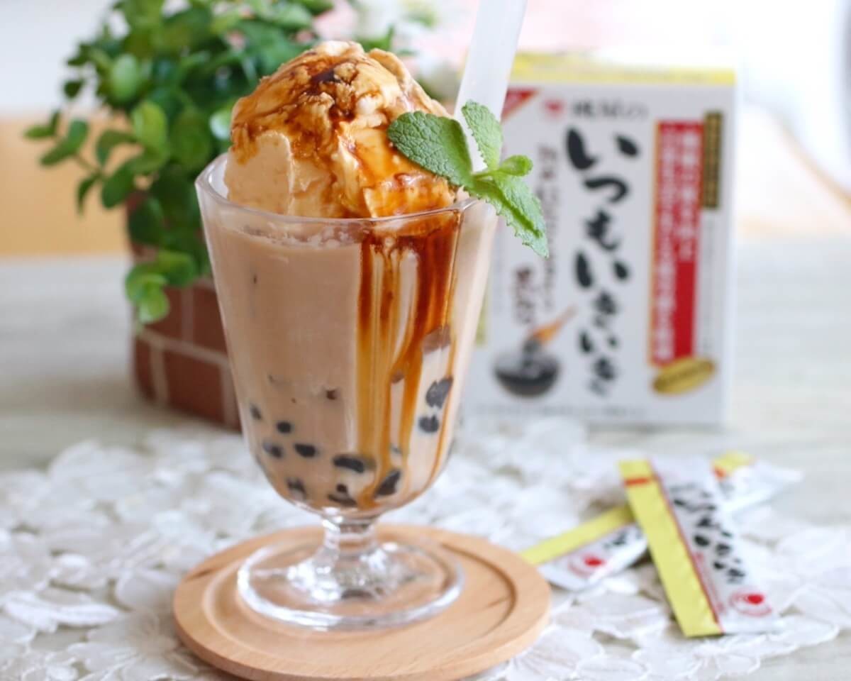 冷凍のタピオカが簡単に手に入るので、とっても手軽に「おうちタピオカドリンク」が作れます。そこに、『いつもいきいき』の黒みつ・黒糖の香りを加えて、バニラアイスを乗せるとおしゃれなティータイムに早変わり。