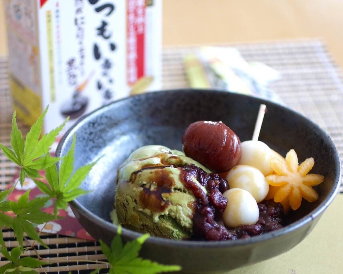 抹茶アイスとあんこや白玉団子、柿、栗などを盛り付け、最後に『いつもいきいき』をたら〜りとまわしかけます。友達との楽しいひと時におすすめ!と@mokomelo_さん。