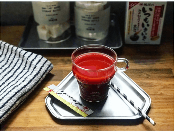 朝忙しくてコーヒーを飲めなかった日は、お風呂上がりのトマトジュースに入れて飲む、というルールにしているのだそうす。
