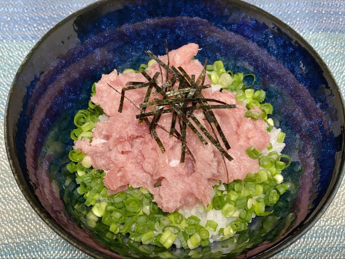 酢飯の上にマグロ、小ねぎ、のりを適量のせてお好みで醤油をかけたら出来上がり。