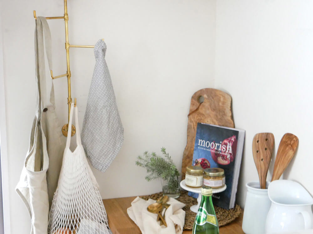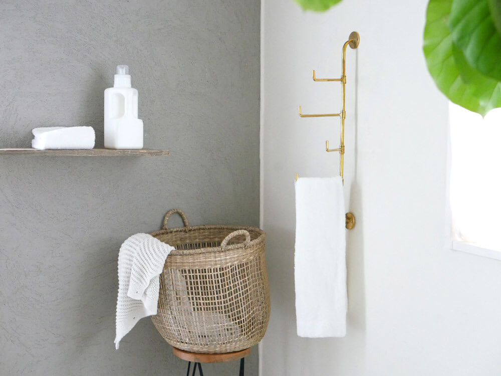生活感の出やすいサニタリールームにムードを創り出す、真鍮の「BRASSウォールフックスイベル」。掛けた物が落ちにくいL字フックで、タオルなどをディスプレイするかのように収納できます。