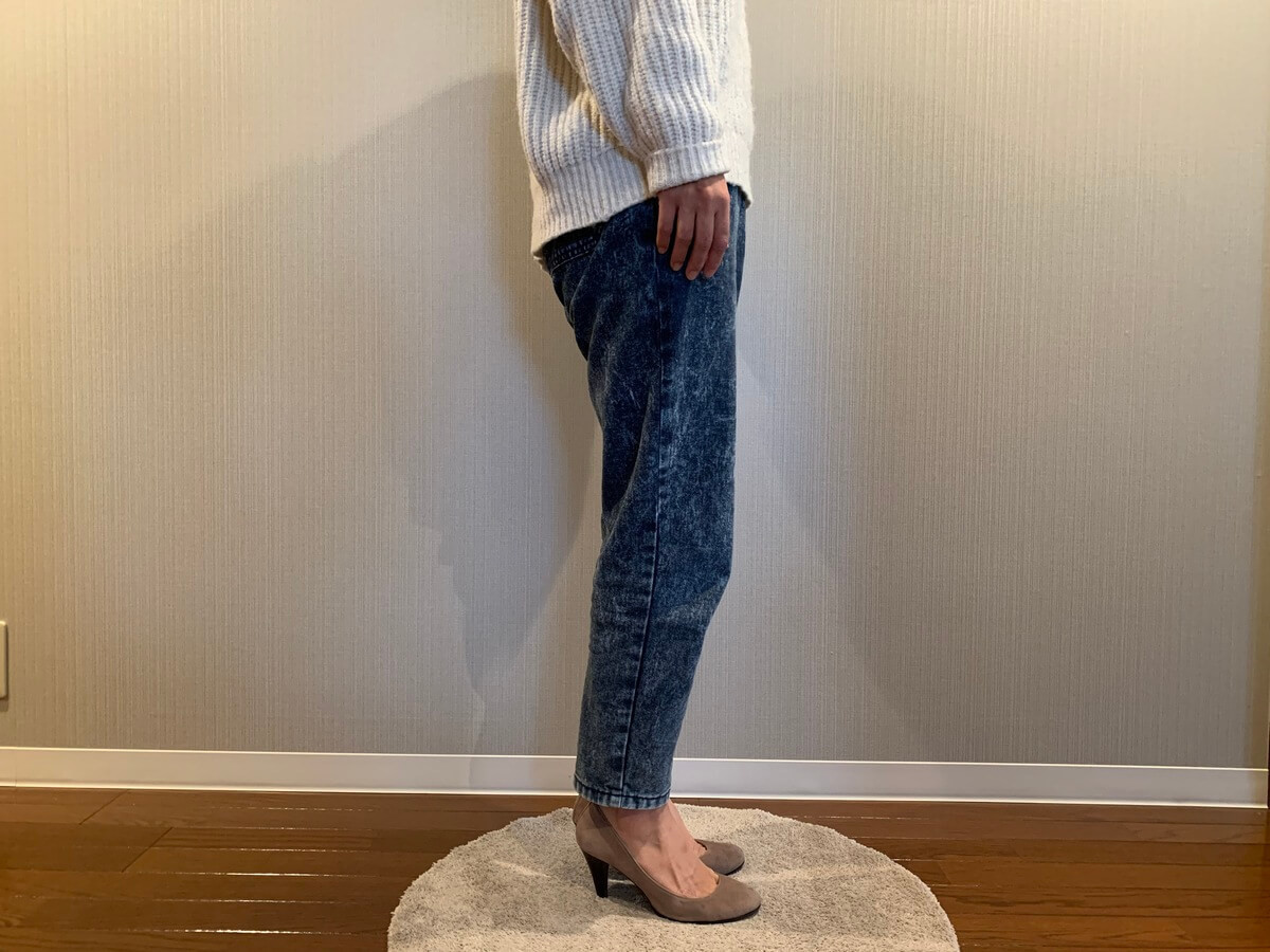 ヒールのある靴なら、トップスを少し長めにしてもバランス良く着れそうだと思いました。横から見てもすっきりしたシルエットになります。