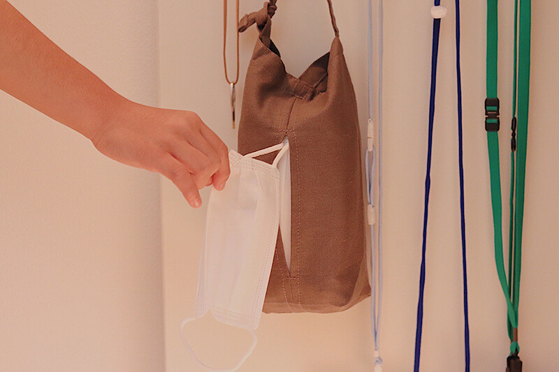 紐を通して吊るすタイプだから、玄関周りやドアの面など、ここなら見落とさない!という場所にマスクを吊るしておけるんです。