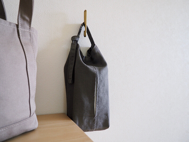 「空中収納、ほんとに便利◎好きな場所に引っ掛けてサッと取れるのがいいところですが、柔らかいリネン生地なのでそのままバッグに入れて持ち運んでも重くないです。