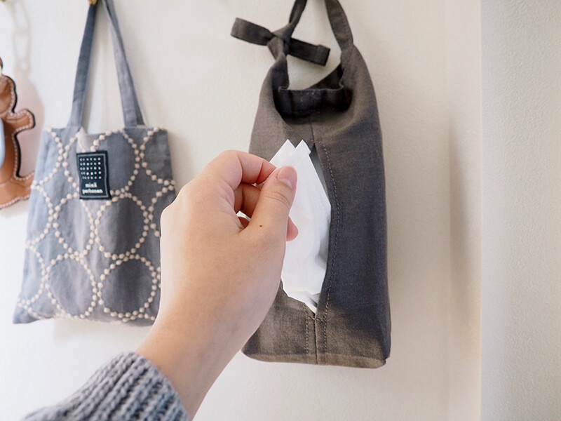 マスクでもティッシュでも、ケースが軽いからお出かけや子供の集まりにそのまま持参できそうだし、マスク忘れ防止に車に引っ掛けておくのもいい。出し入れはスナップボタンひとつ。紐の長さは調整できて、結ぶだけのシンプルさです。」