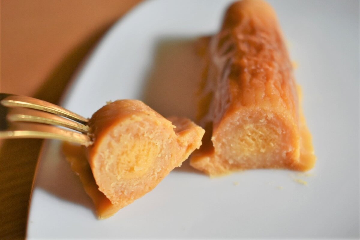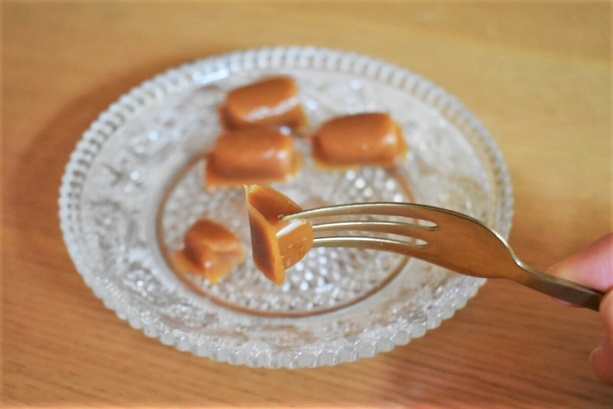 生キャラメルの硬さはどれくらいなのか、フォークで切ってみます。