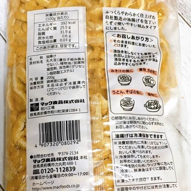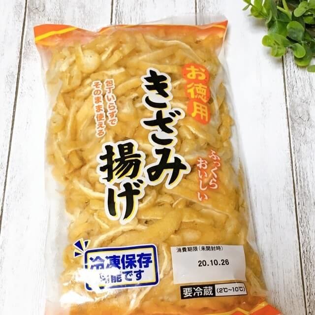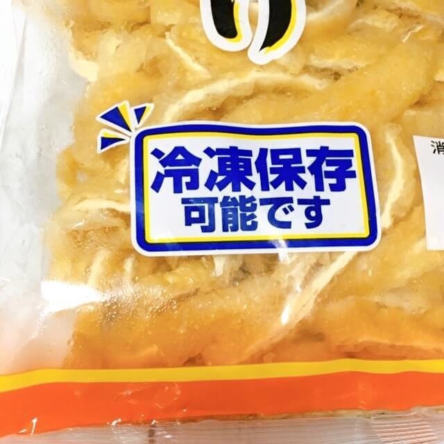 刻み油揚げといえば業務スーパーにもありますが、500gで参考価格275円(税別)。初めから冷凍されている輸入品でした。
