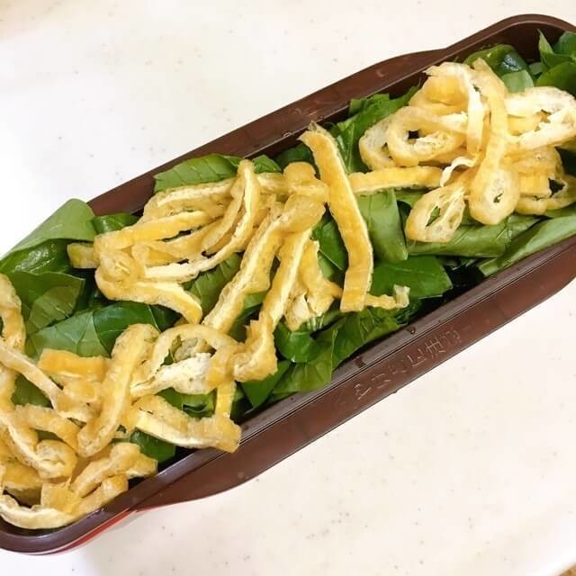 切った小松菜を3コインズのパスタメーカーに入れ、上にきざみ揚げを乗せる。