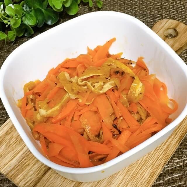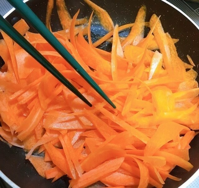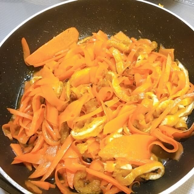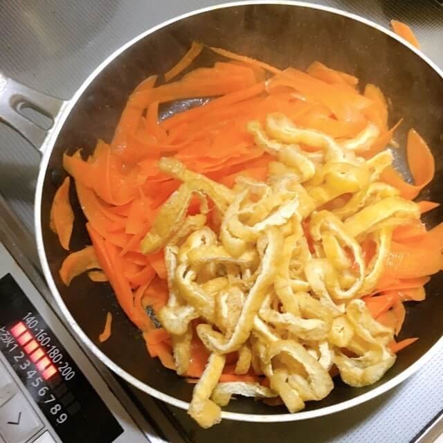 人参を千切りしてフライパンに油をひいて人参を炒める。人参に火が通ったらきざみ揚げを入れる。