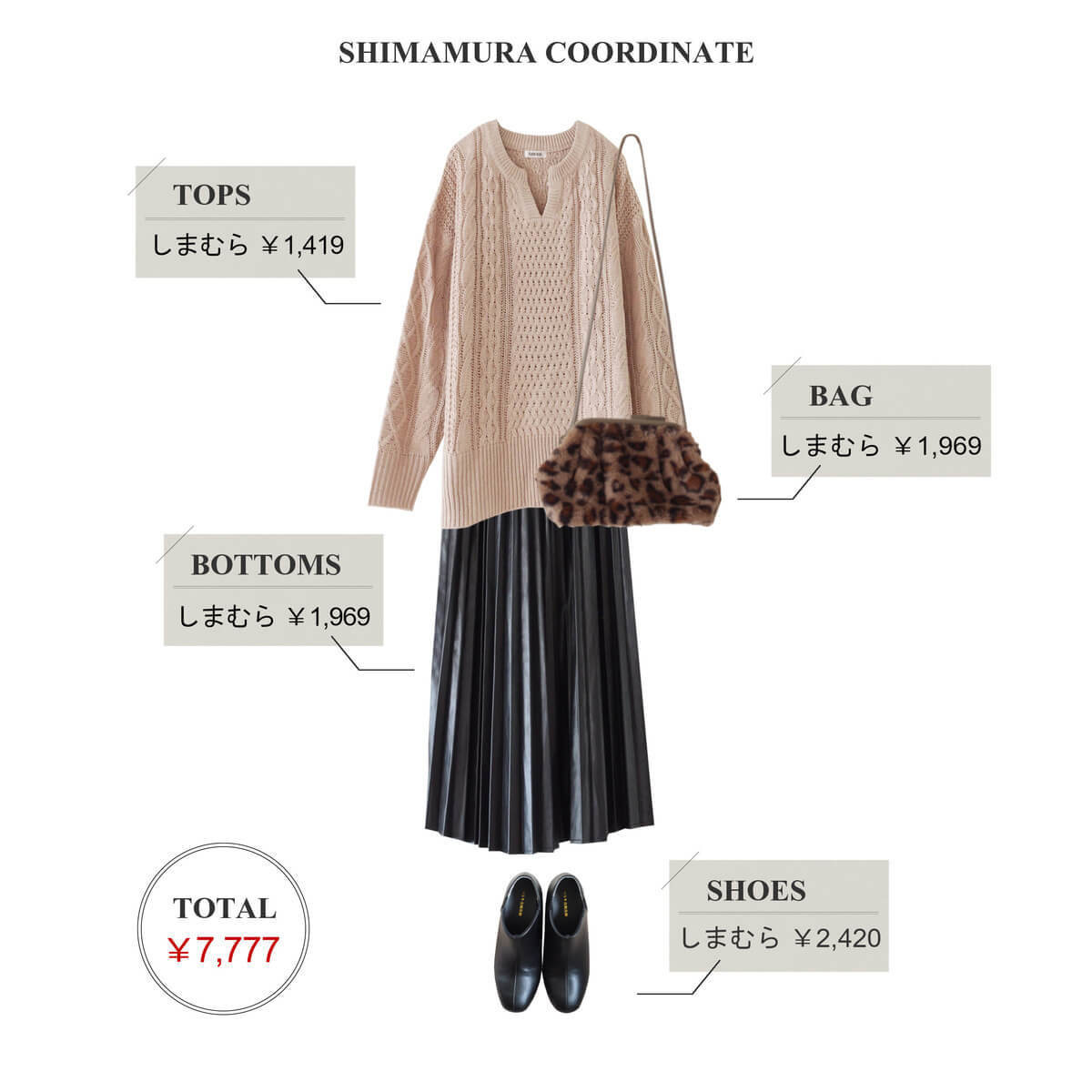 ケーブル編みニットとレザースカートで作る甘辛MIXコーデ。
