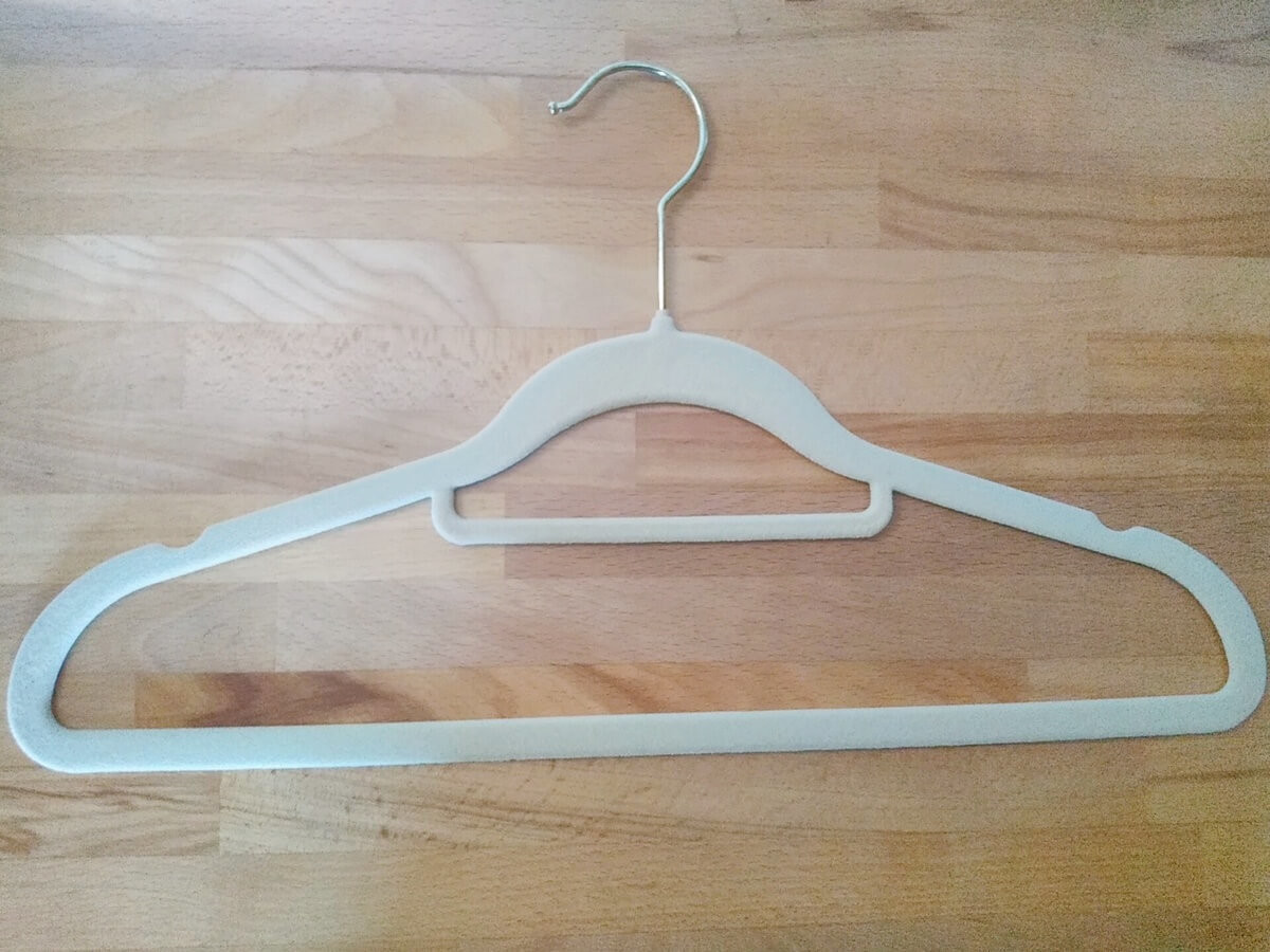 ポイント:ハンガーは滑りにくいタイプがおすすめ。衣類が固定されるので、引っ張りながらアイロンをかけてもズレを起こさず、余計なイライラが防げます。私はフロッキー加工のハンガーを使用しています。