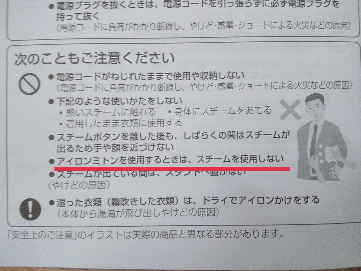 使用する際は、スチーム機能の使い方に注意してください。所有しているスチーマーの説明書には「アイロンミトンを使用するときは、スチームを使用しない」と注意書きがありました。