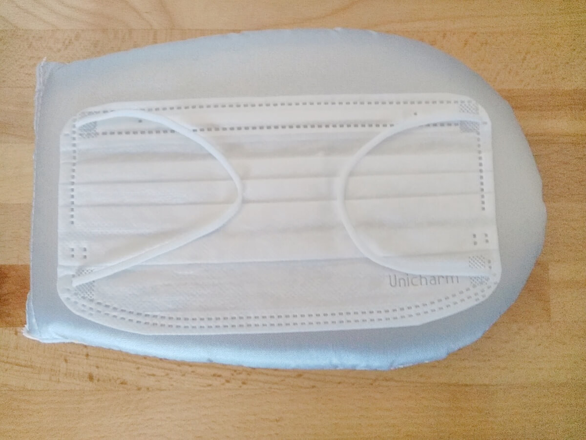 机に置くとミニアイロン台のように使えます。布のマスクを使っている人にはちょうどよいサイズ感だと思います。私は使い捨てマスクを使用しているので、参考にしづらいですが、このくらいのサイズ感です。