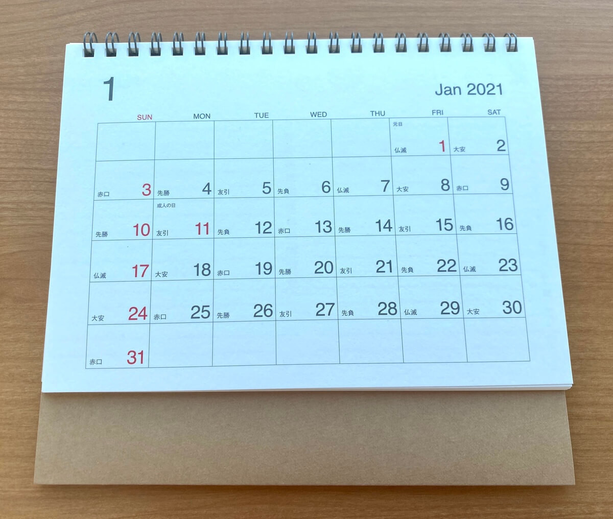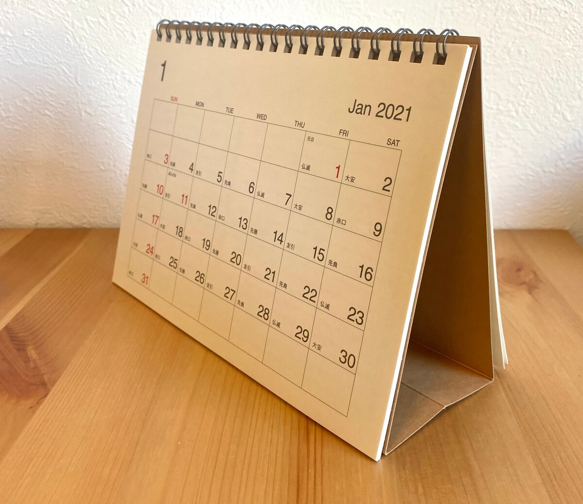 比較的小さめなサイズのカレンダーですが、日にちが大きめに記載されているので、離れた場所からでもカレンダーをしっかり確認することができます。このように、立てて設置することも可能です。