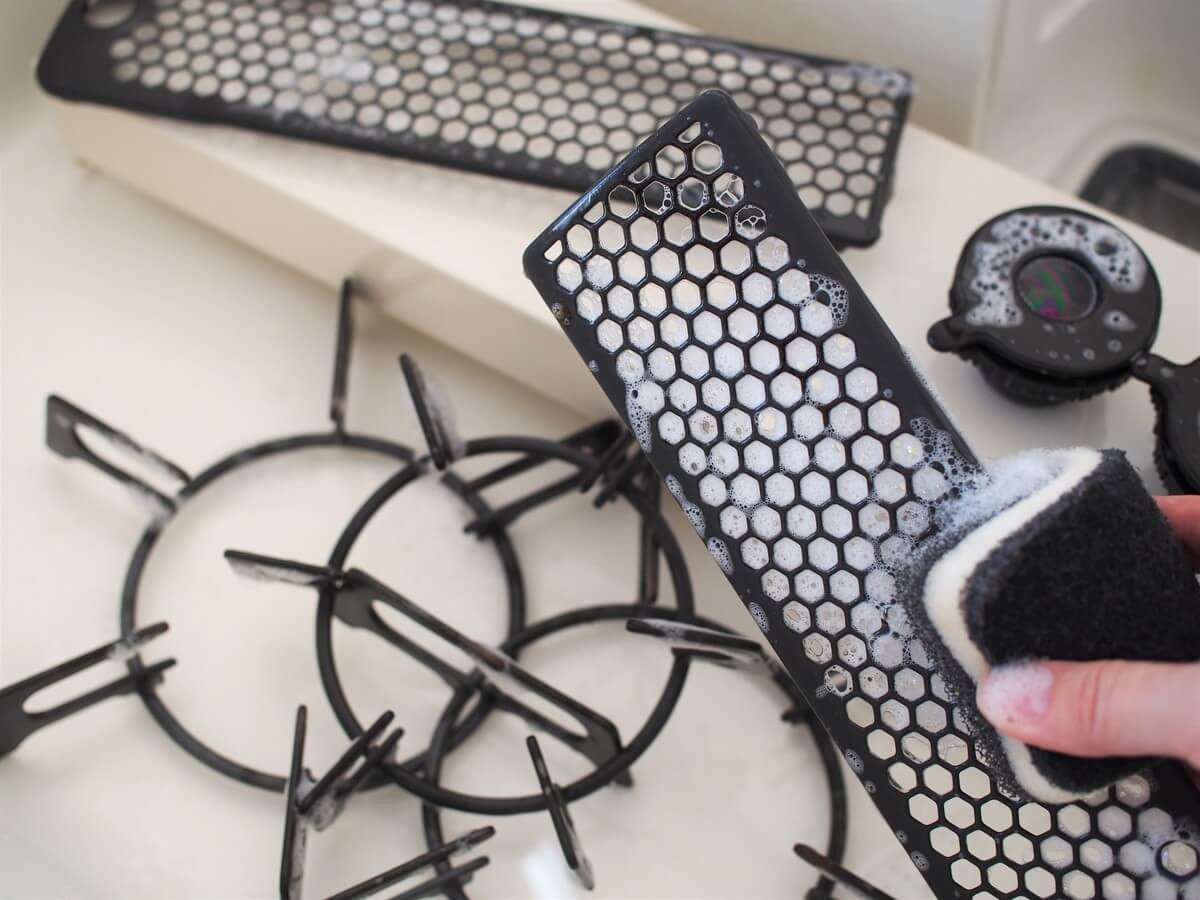 柔らかいスポンジに台所用洗剤をつけて、五徳や排気口カバーを洗います。