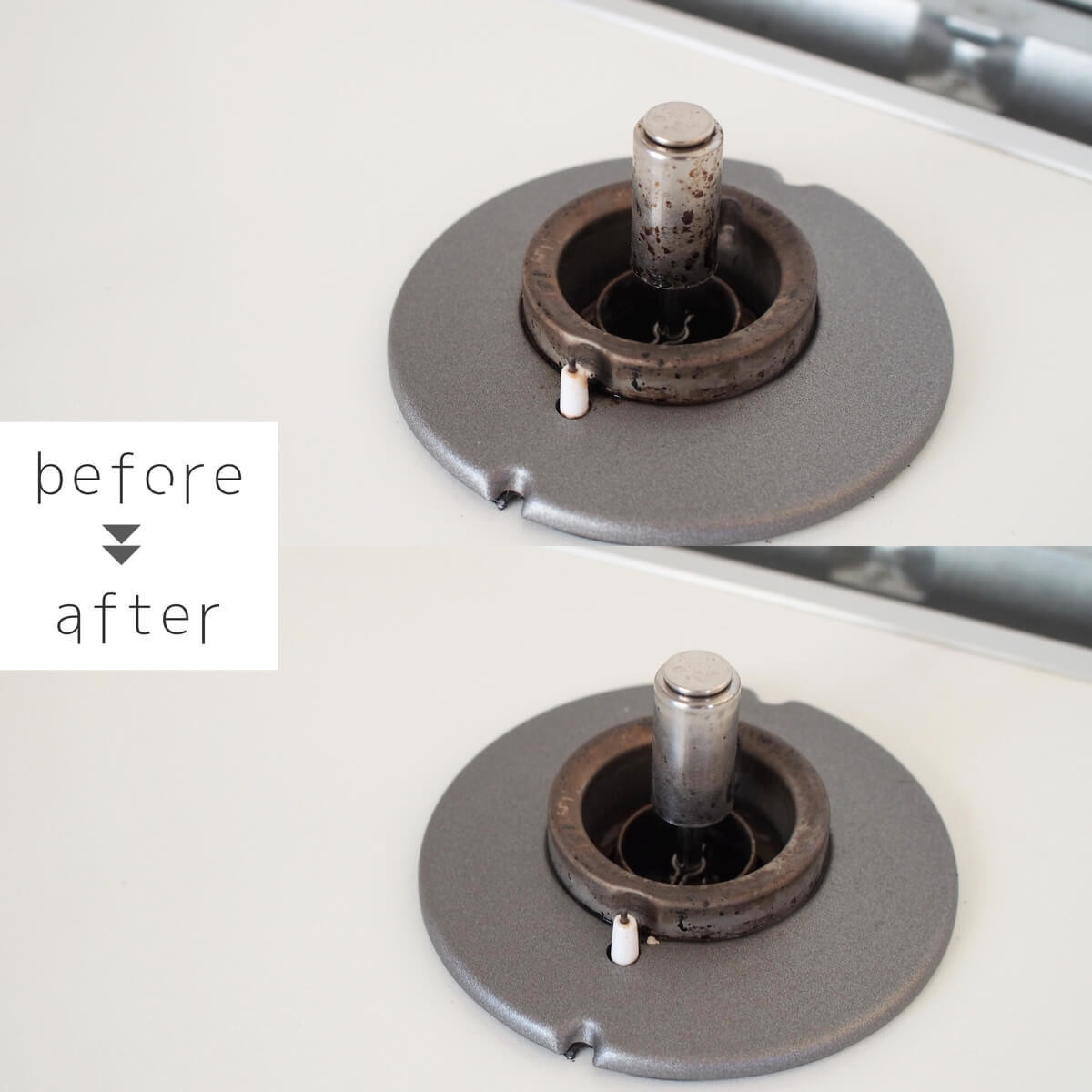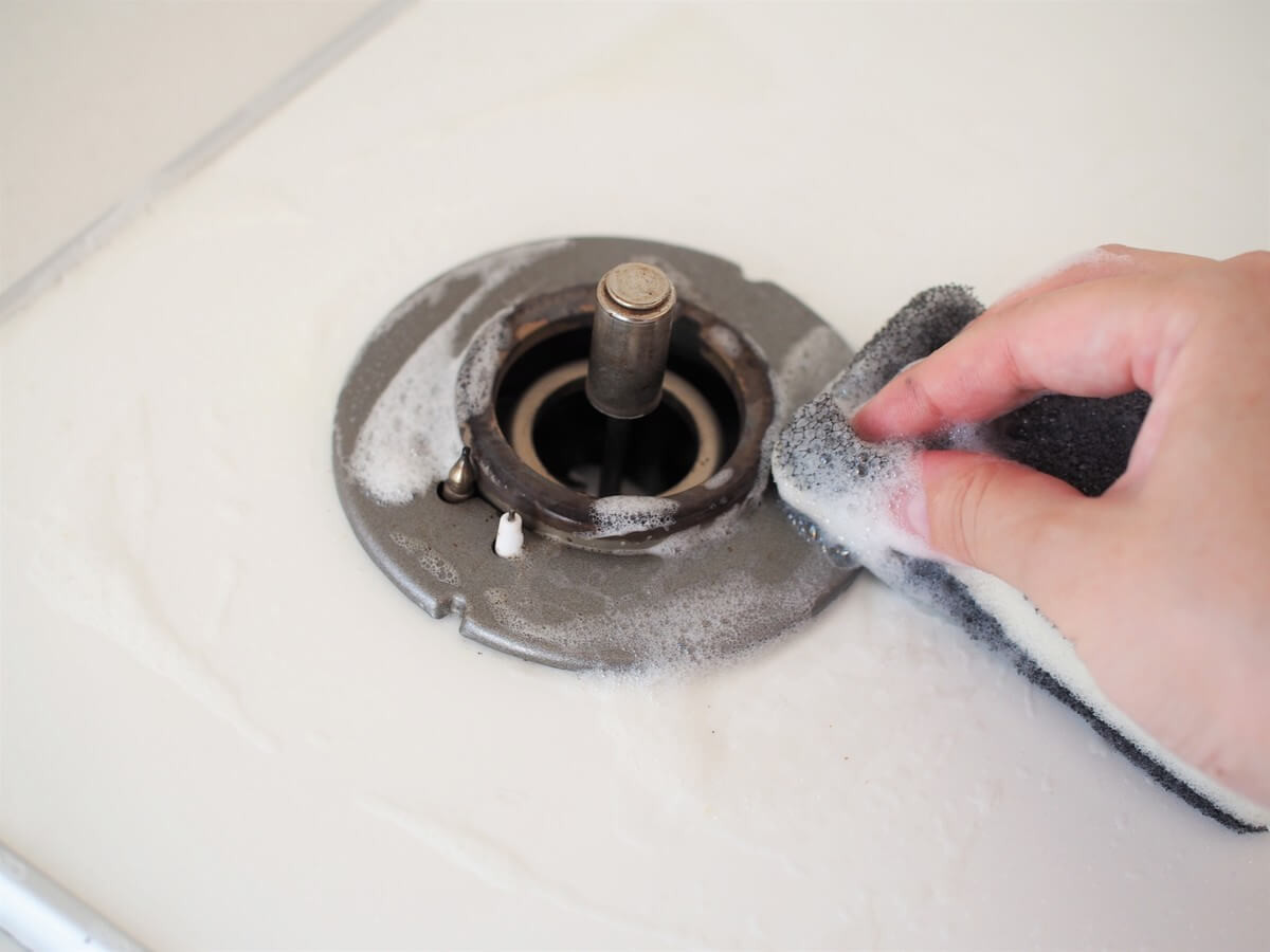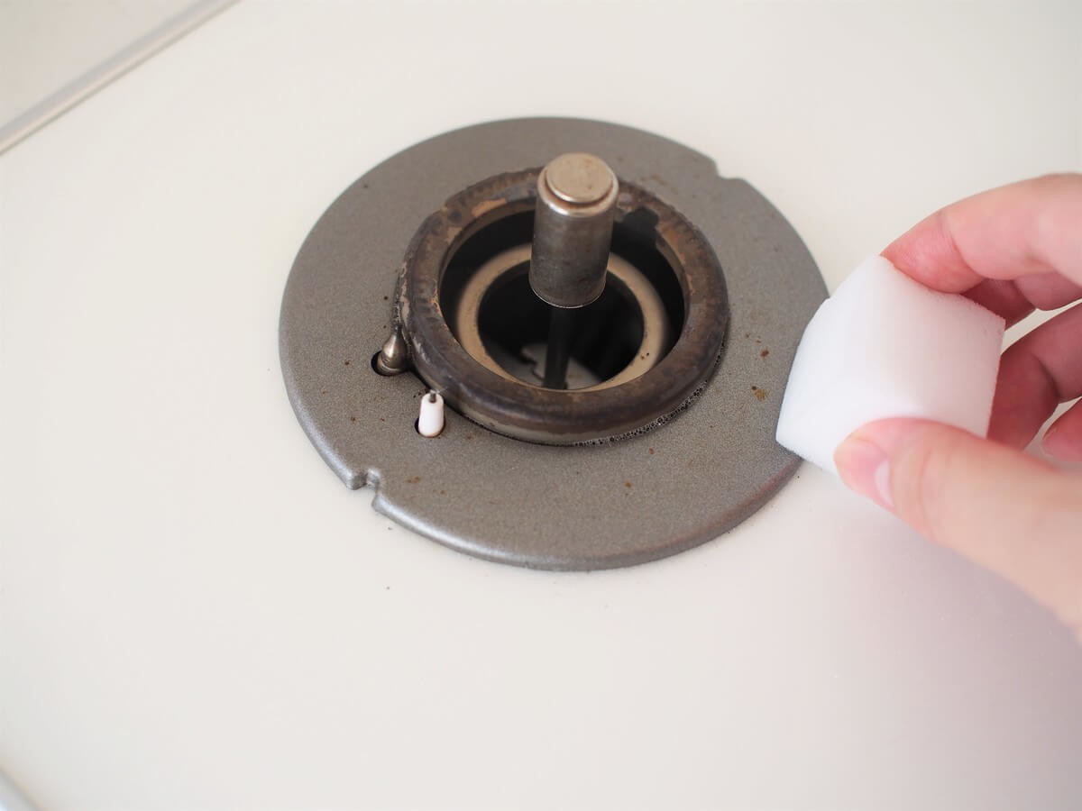 五徳や排気口カバーについたがんこな汚れが気になる場合は、40〜50度くらいのお湯に重曹を溶かし(1Lに対して重曹大さじ1が目安)、つけ置きすると汚れがゆるみます。