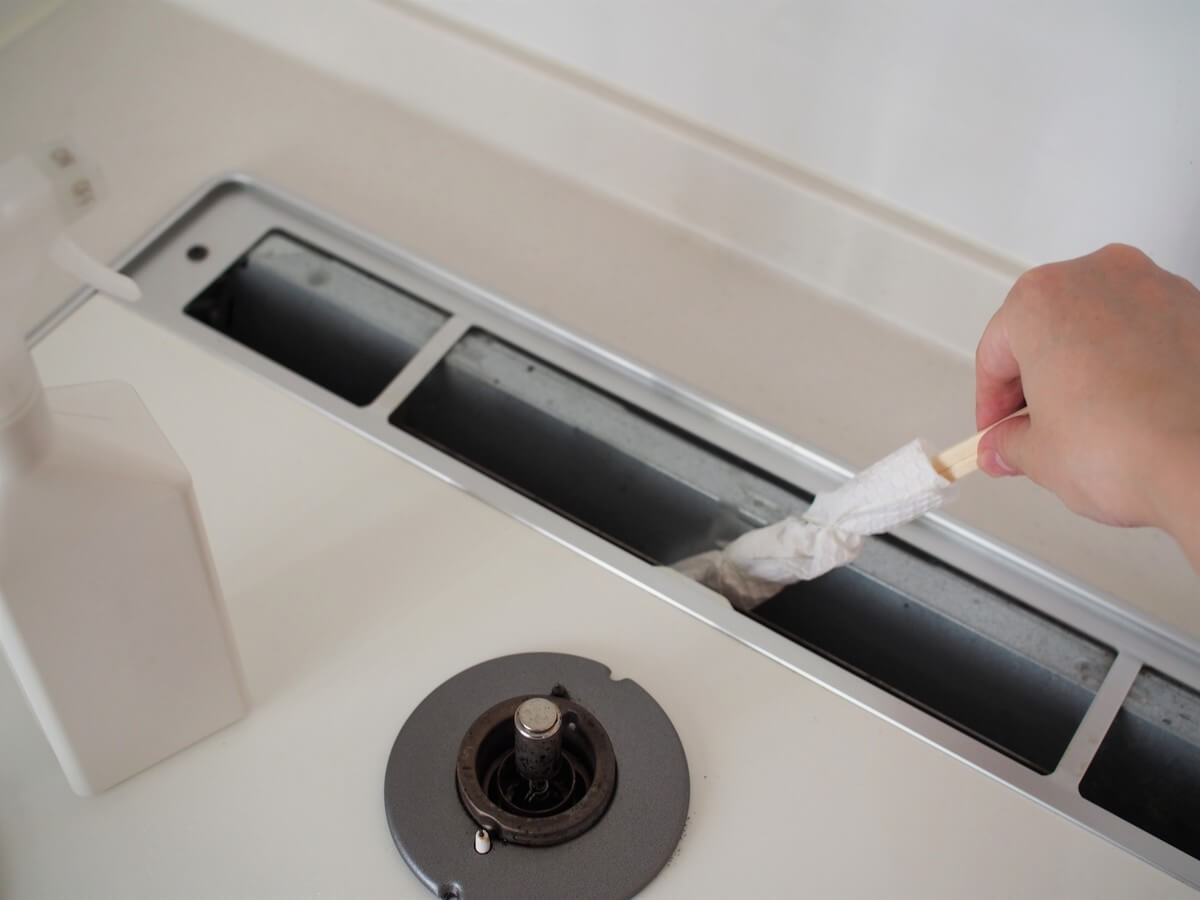 割り箸に先ほど使ったペーパータオルなどを巻いて輪ゴムで止めたものにアルカリ電解水をふきかけ、排気口を拭きます。