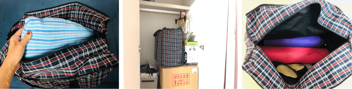 来年まで収納したいなと思うものを、衣替えの時に整理したのですが、整理されないまま置いてあったわが家。当初はブランケット4枚を収納する予定でしたが、8枚近く収納できたのは驚きの大容量(左・中央)。見た目の2倍入ります。(@massu.shioshioさん)