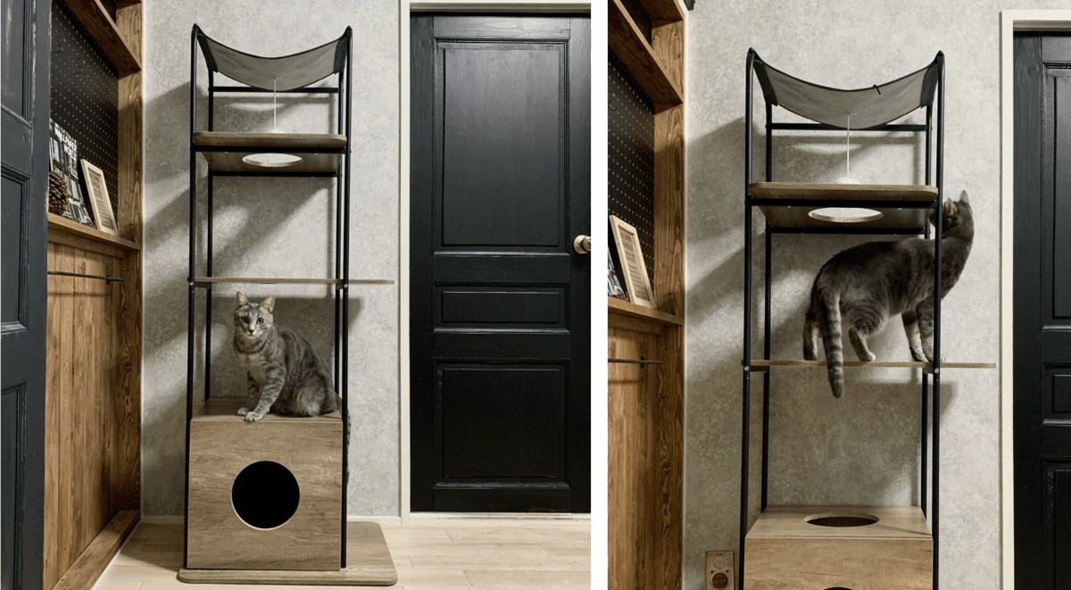 DIYで家中を男前インテリアに統一しているので、生活感がなく、インテリアになじむキャットタワーを探していました。さらに、今まで使っていたキャットタワーは、毎日拭いていてもだんだんと薄汚れて行きましたが、このウッディキャットタワーは、サッと拭けばきれいになる素材。愛猫に清潔な場所を用意してあげられて嬉しいです。(@asty_styleさん)