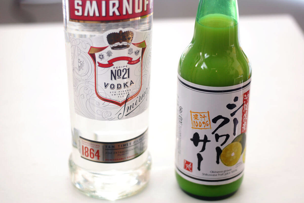 主人のこだわりは、シークヮーサーハイにウォッカを使うこと。ウォッカとシークヮーサーをグラスに注ぎ、そこにたっぷりの強炭酸を加えたらシークヮーサーハイの完成。