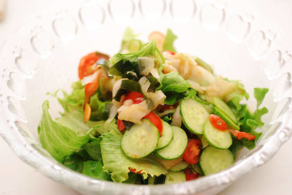 この和風ドレッシングはどんな野菜も合いますが、レタスなどの葉物野菜とピーラーでスライスした大根、生わかめなどを合わせるのがおすすめ!シークヮーサーの酸味と香りが海藻と大根の風味にドンピシャでハマります!