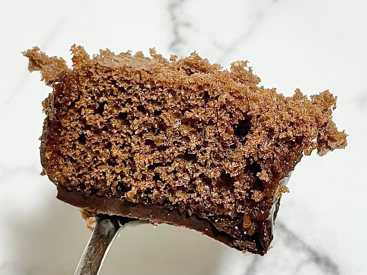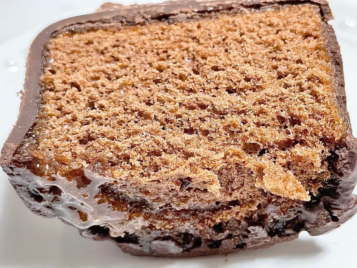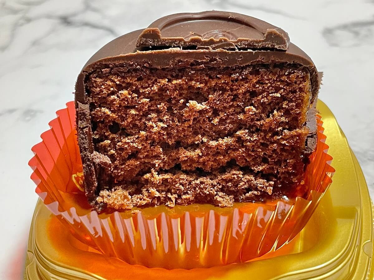 チョコレートスポンジはふんわりと柔らかいですが、単品で食べるとややパサつくのが気になるところ。