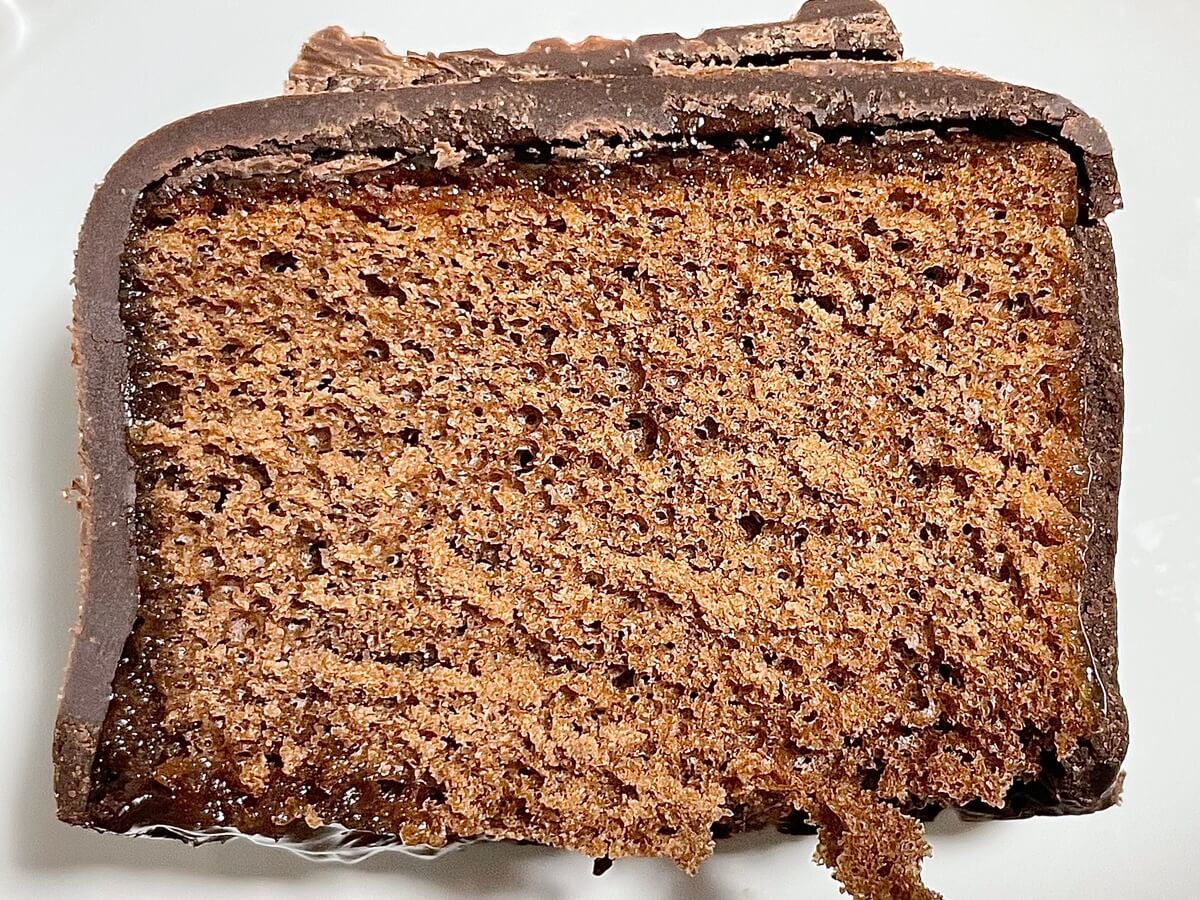 近くで見ると、スポンジとチョコレートの間に薄くあんずジャムが塗られていることが分かります。