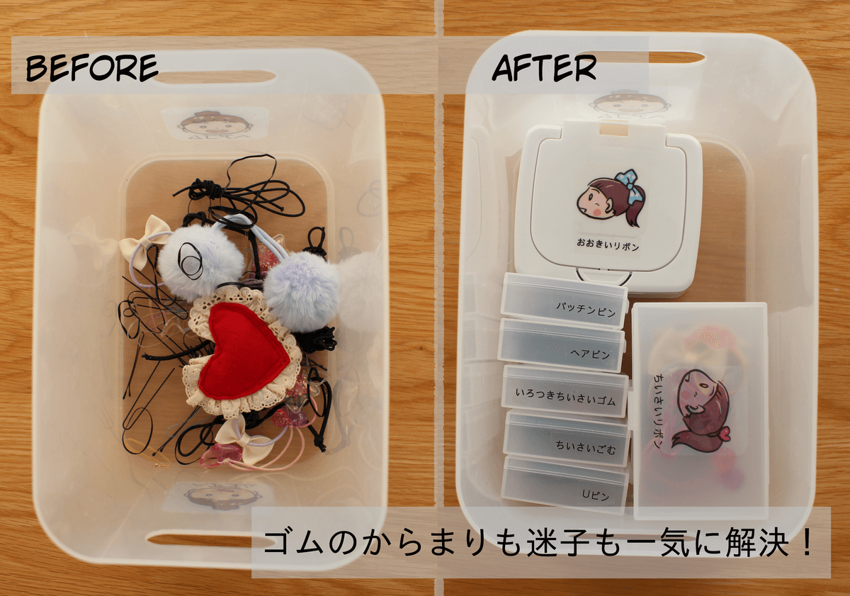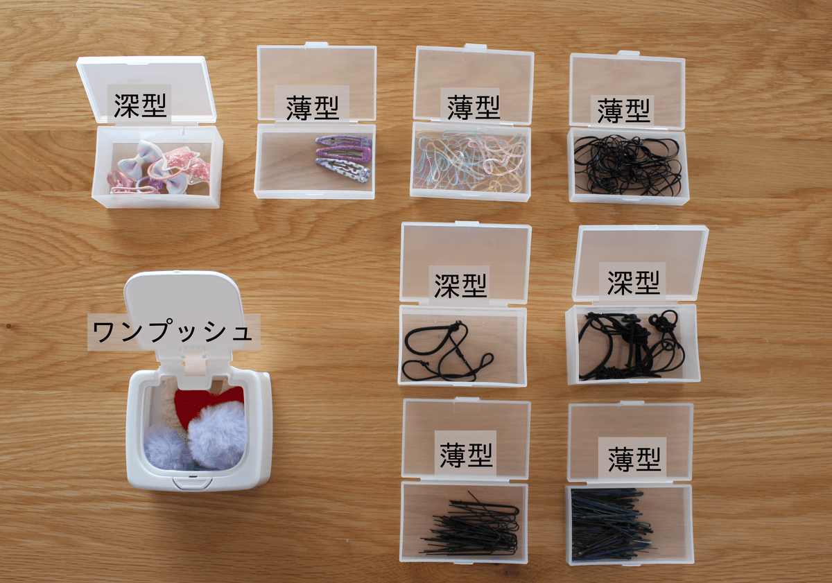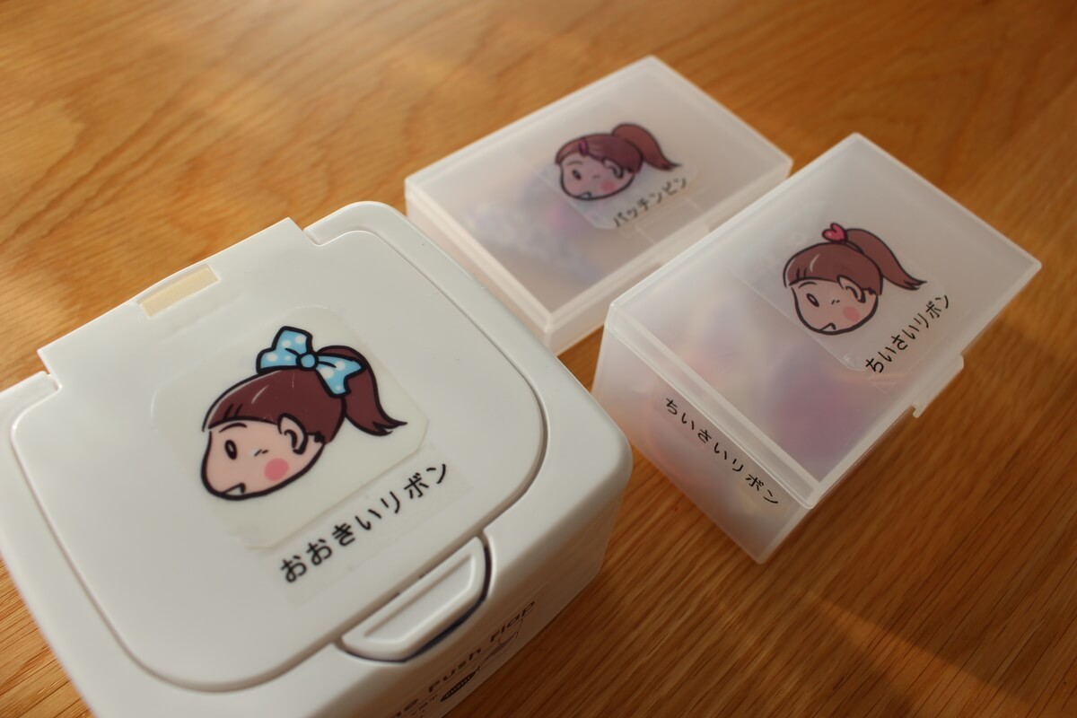 - "リボン(大)"はサイズが大きく、子どもが選ぶことが多いので一番取り出しやすい"ワンプッシュ 小物ケース"