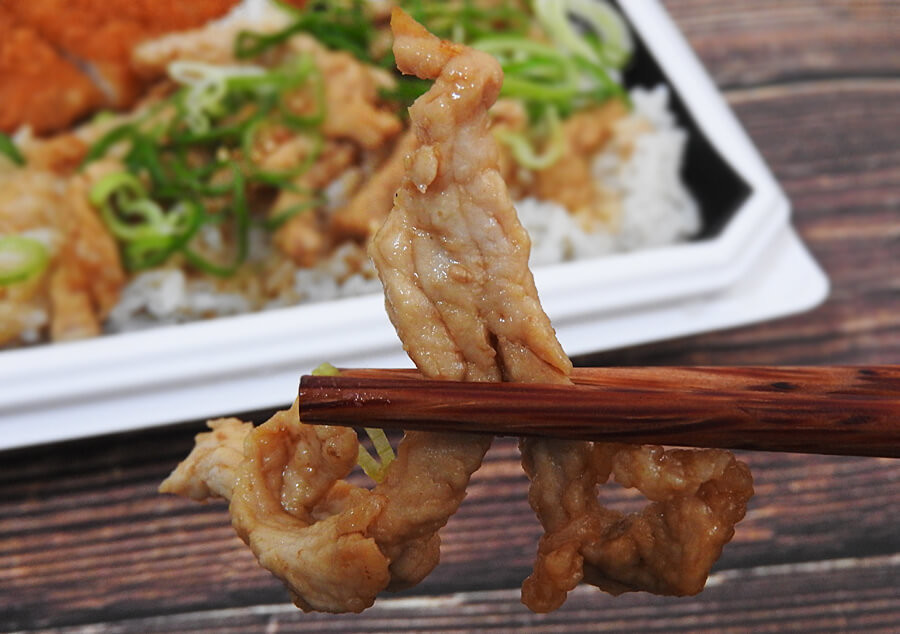 今回のお弁当とは別件で、「全力ご飯!」生姜焼きご飯も食べてみました。「肉たまごかけごはん」と同じくお肉がパサついていますね。おろし生姜がかかっていて生姜はよいアクセントにはなっていましたが、お肉がちょっと残念でした。