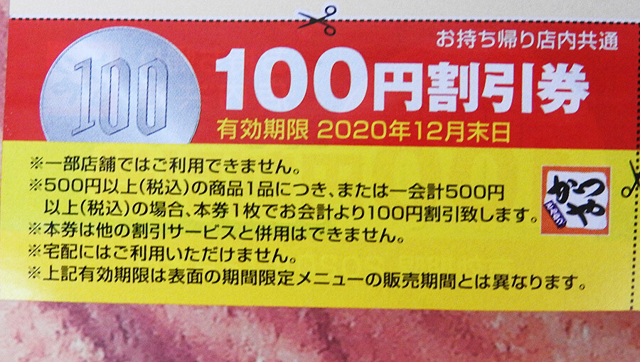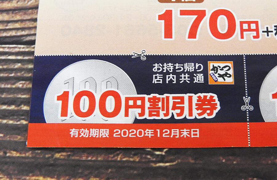 かつやではお持ち帰り時に「100円割引券」がついたチラシをもらうこともあります。「なんだ、チラシか」と思って、すぐに捨てないようにしましょう。次回、かつやでお持ち帰りする時に使えば、100円割引になりますよ。