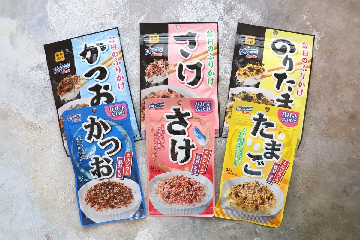 味の違いを探るべく、かつお味、さけ味も含めて「Hagoromoパパっとふりかけ」の商品も購入し比較してみました。