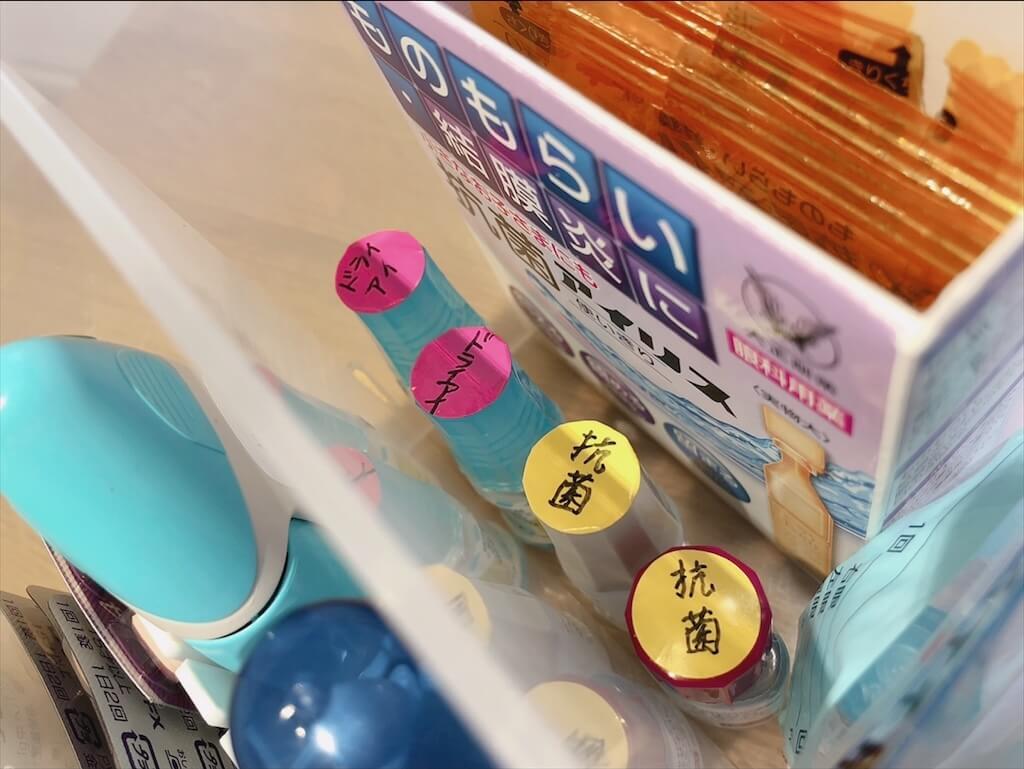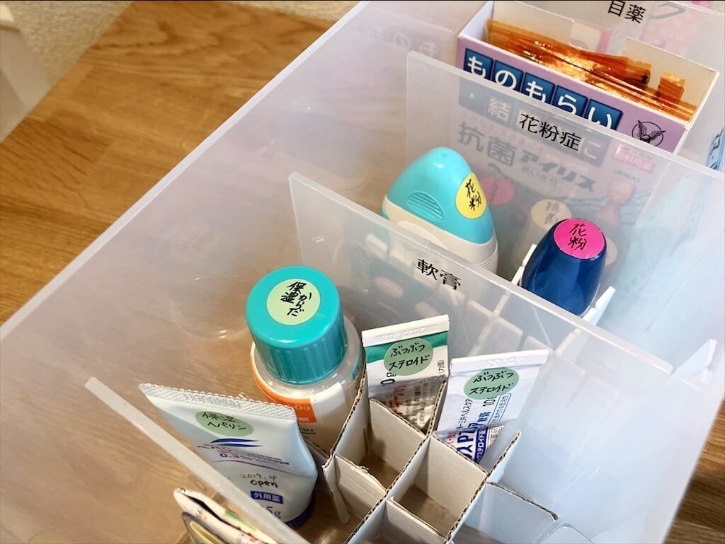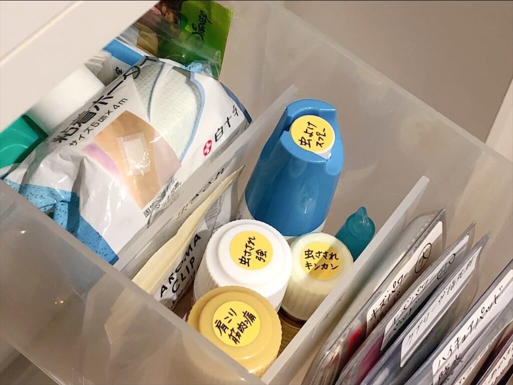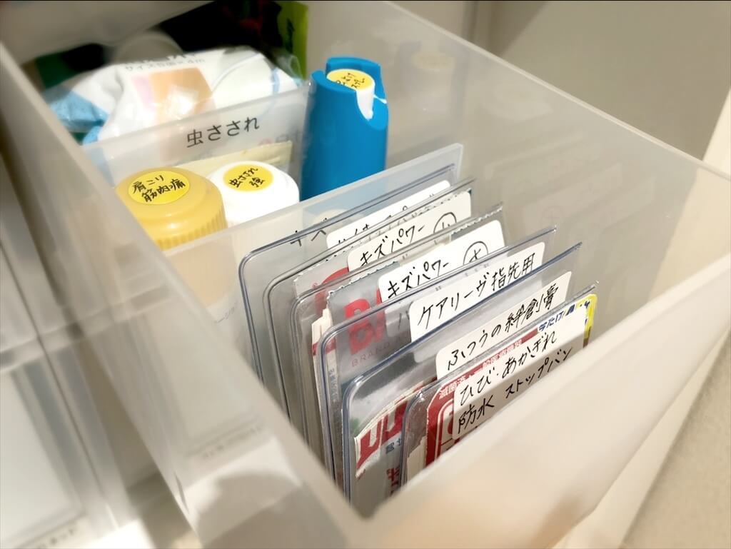 我が家では外用薬の引出しに虫除け・虫刺され・筋肉痛に使うぬり薬がありますが、上から見た時にすぐに分かりづらいのが気になっていました。