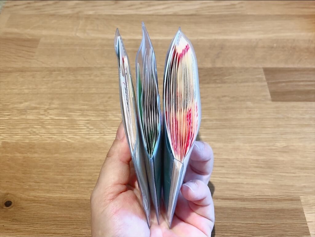そこで我が家では、ダイソーの「ソフトカードケース(軟質カードケース)」に入れ替えて、スペースを抑えながら収納しています。