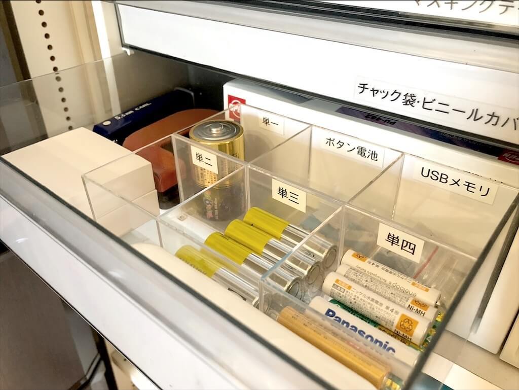 単1と単2は立てて収納し、単3と単4は寝かせて収納しています。
