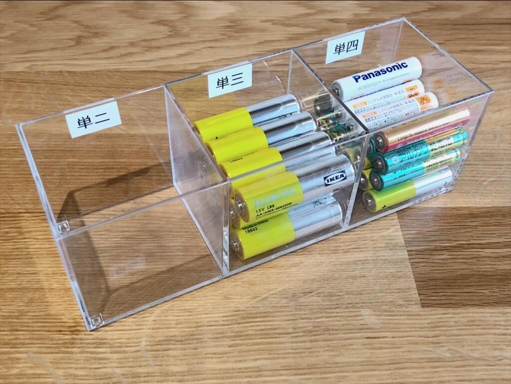 それぞれの居場所がきっちり分かれたので、使うときも迷わず取り出せますし、買い足す時もどの電池が足りていないのかがすぐにわかるようになりました。