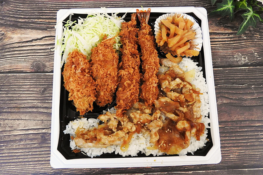 大きなカキフライと海老フライが印象的なかつや「秋の海鮮フライ弁当」690円(税抜)。通常は白米ですが、同時期に数量限定品として登場している「全力ご飯!」の「生姜焼きご飯」にしてみました。